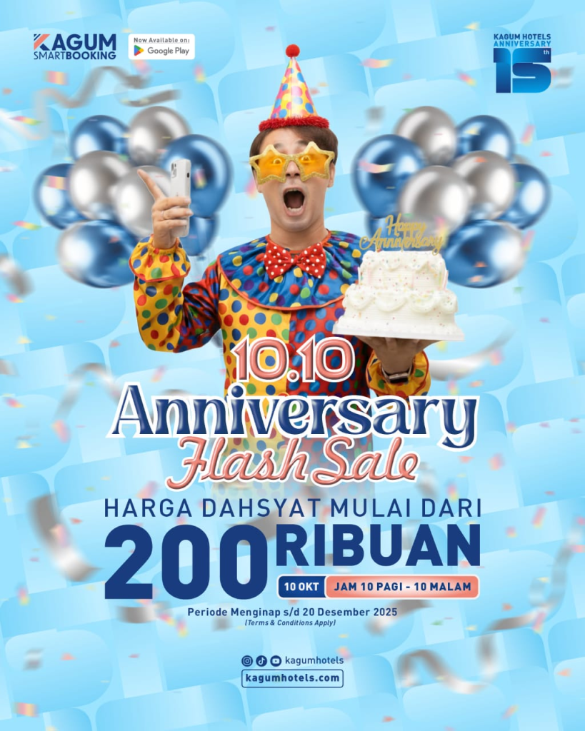 Tinggal book Hotel apapun di KAGUM Smart Booking www.kagumhotels.com tanggal 10 Oktober 2025 mulai pukul 10 pagi sampai 10 malam dan kamu sudah otomatis dapat harga spesial Anniversary Flash Sale 2025 ini!