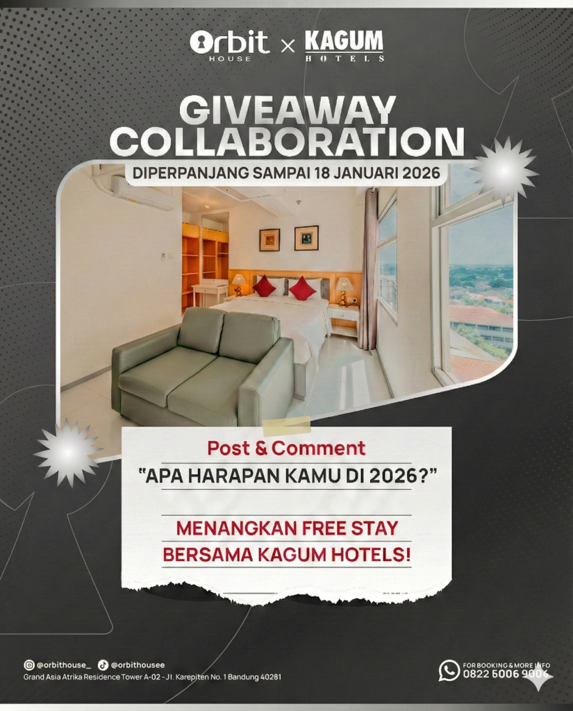 Buat post dan comment dengan tema caption “Apa Harapan Kamu di 2026?”, lalu pastikan tag, follow, comment, dan like sebanyak-banyaknya instagram @kagumhotels dan @orbithouse_ yaa,