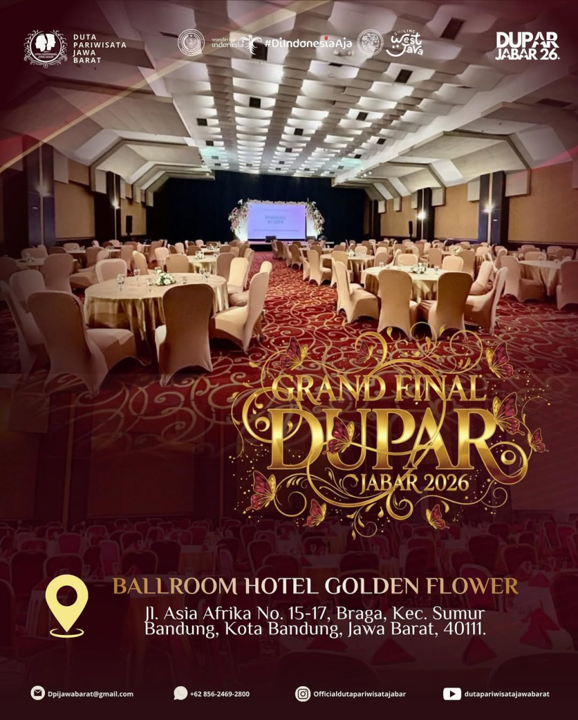 Yuk berpartisipasi untuk menemukan Duta Pariwisata Jawa Barat 2026 dan hadiri THE GRAND FINAL SHOW DUTA PARIWISATA JAWA BARAT 2026 di Golden Flower Hotel Bandung pada tanggal 8 Februari 2026!